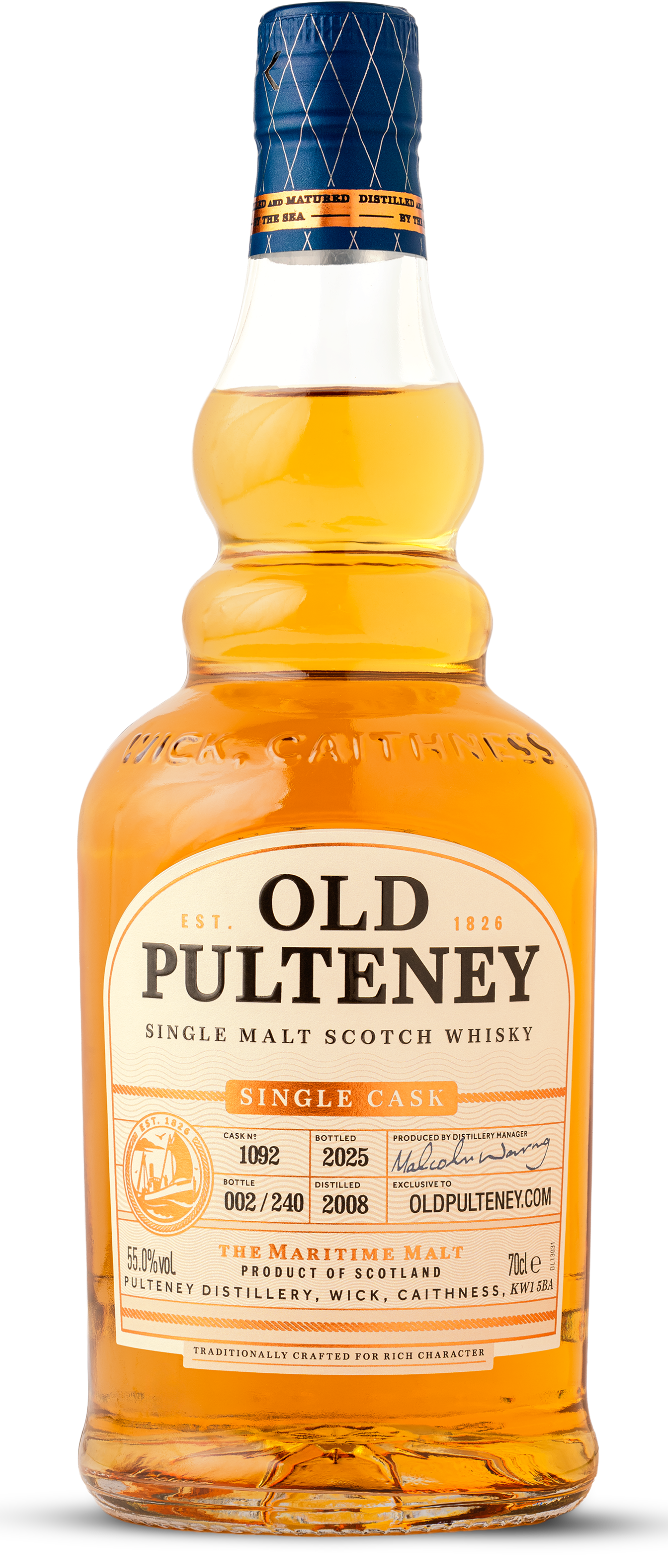 Since 2008, Old Pulteney Single Cask #1092 has been carefully matured in a first-fill American oak ex-bourbon barrel that was hand-selected by our Distillery Manager. With only 240 bottles available, this warming single malt offers a unique take on Old Pulteney.